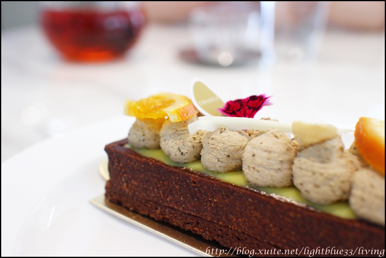 這麼多的元素組合,原本會讓人有點擔心會不會太複雜,不過垂直由上往下切一段入口後,綜合起來的滋味頗為令人驚豔,伯爵香緹嘗起來很有伯爵鮮奶茶的感覺,沾一小口單吃就很有鮮明的存在感。黃色的餡吃起來帶有柑橘類的香氣和酸味,跟巧克力甘納許塔底非常搭。