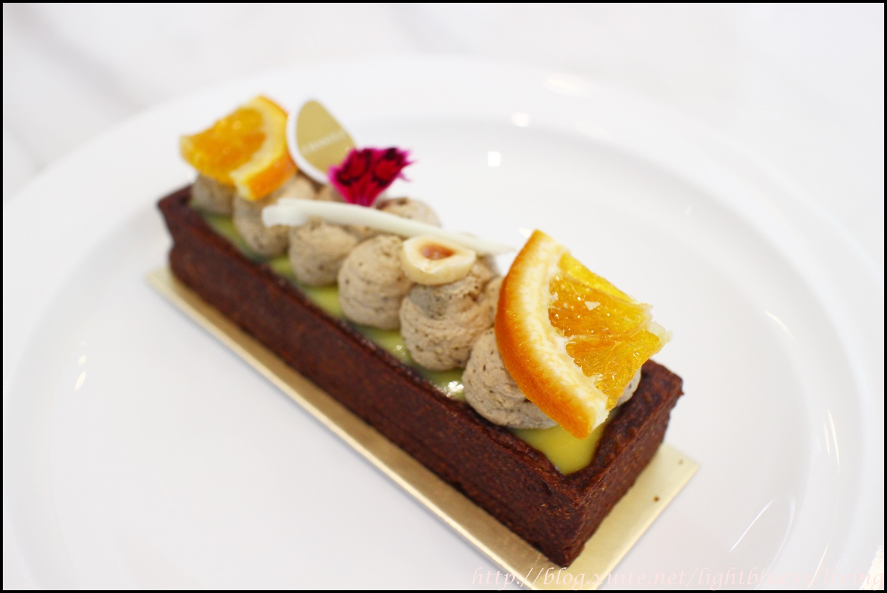 榛果醬則是在塔底,雖然只有薄薄一層,卻有濃濃核果香,口感控制得很好,沒有過於濃稠,苦甜味大於甜味,作為柑橘酸甜與甘納許苦甜很好的中繼