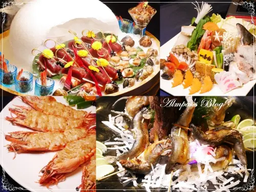 裡面有黑鮪魚、鮭魚洋蔥生魚片、干貝起司、螺肉、醃製軟絲黑鮪、甜蝦