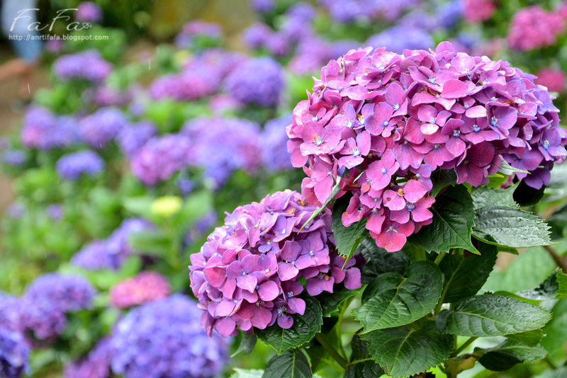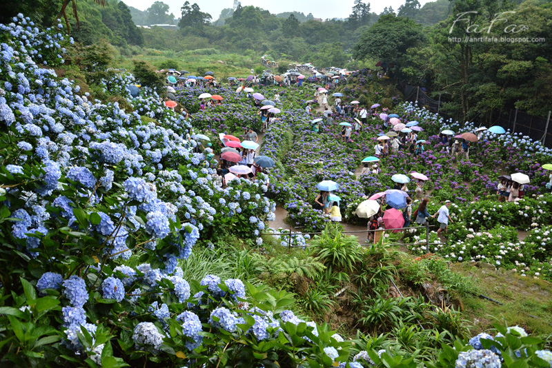 剛好不少人的雨傘都是淺色粉紅或粉藍,與眼前的繡球花田很相襯。
