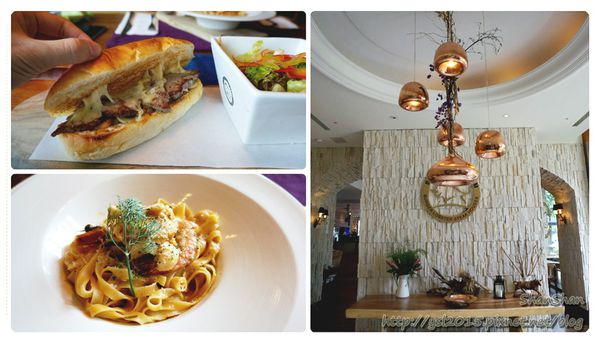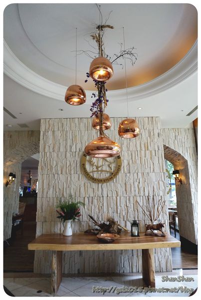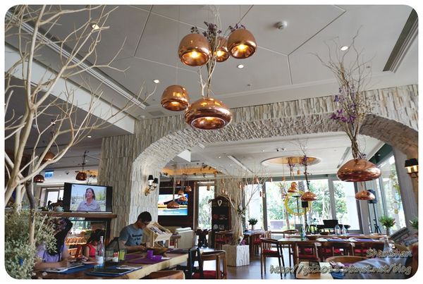 用餐空間很大,原木傢俱十分講究,用乾燥花妝點的燈飾相當漂亮,陽光透過大片落地窗灑在米白牆面,環境完全無可挑剔!