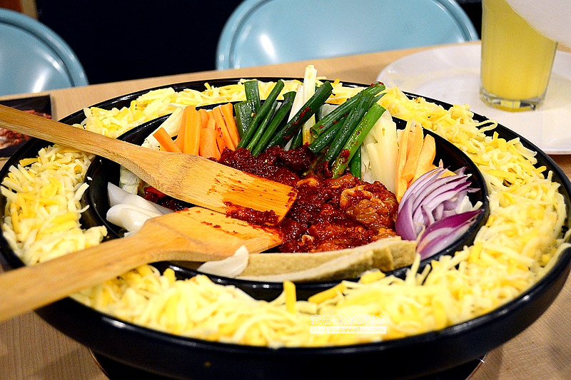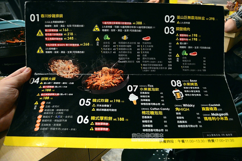 ▼來看看餐廳,主餐部分主要分成三種 春川炒雞排鍋、釜山巨無霸海鮮盆、以及銅板燒肉,價格並不貴,衝著招牌上寫的乳溝起司,就點了春川炒雞排鍋裡面的 李光洙愛情(雙份起司)春川炒雞排鍋!
