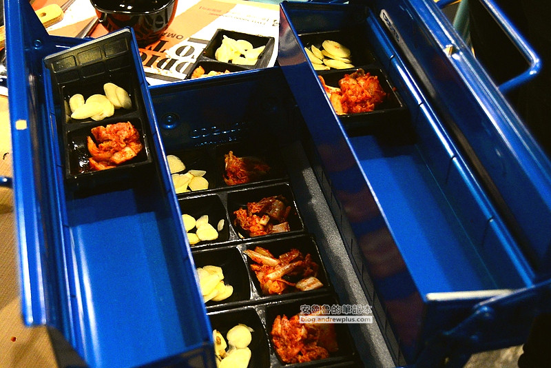 ▼等待的同時~服務人員突然送上一個工具箱到桌上,打開來後原來裡面放著泡菜和蒜片!