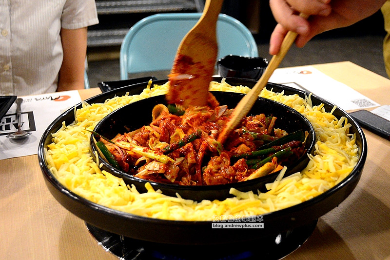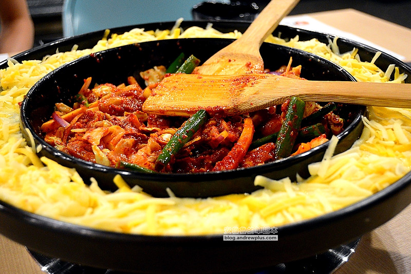 ▼等到周圍的乳溝起司都已經慢慢的融化了,中間的食材也都變成了紅色的了~就可以開動囉!店員還特別交代不要等到起司冷掉變硬了,一定要趁熱吃!