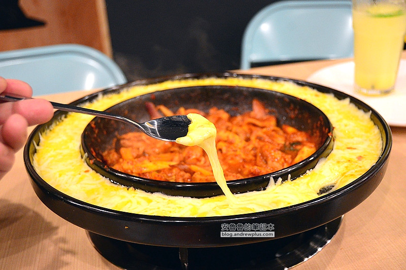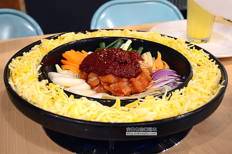 食材有韓式泡菜、年糕、魚板、洋蔥、紅蘿蔔、馬鈴薯、蔥段以及不可或缺的韓式辣醬,外圈則是雙色摩扎瑞拉起司!