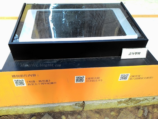 鐘樓的平台正前方可用QR CORD播放影片。內容有教堂50周年紀錄片、貝聿銘、陳其寬兩位