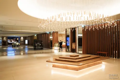 木樑整齊排列,正中吊燈散發溫暖的光芒。