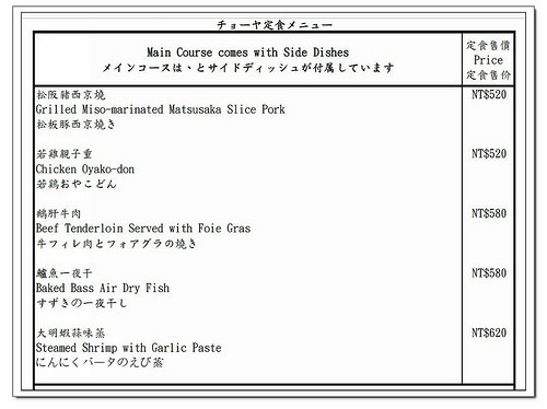 這次的晚餐,我們選擇了位於麗池館二樓的蝶屋日式餐廳,副食為固定的,主菜則有以上五種松阪豬西京燒、若雞親子重、鵝肝牛肉、鱸魚一夜干、大明蝦蒜味蒸可以選擇。