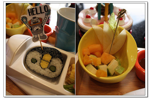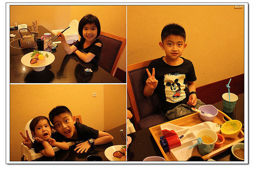 重點是小人們繽紛的兒童餐,說真的,這兒童餐我個人覺得不管是營養、創意、份量都很有誠意,孩兒們最愛的火箭盒裝著可愛的動物壽司、飯糰,搭配鮪魚蛋捲、蔬菜、主食(豬排、雞肉),還有飯後甜點以及飲料。