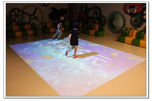 原來這裡是一台高科技投影互動平台,地上會出現一大堆不良機器人拍咪,只要小人們踩過去,機器人就會消失不見。(感覺也是很容易蝦玩、好玩的一關)