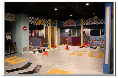 咻咻星球也是小人好愛的設施,這裡和radio flyer合作了許多兒童專屬騎乘,滑步車、三輪車、腳踏車、滑板車等,最特別的是一台用手來操作的輪椅車(<--楚楚命名)。