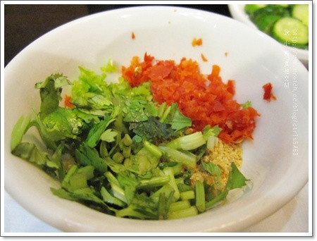 只有店家提供的蘸醬內容有香菜、紅、黃甜椒、青椒、花生粉
