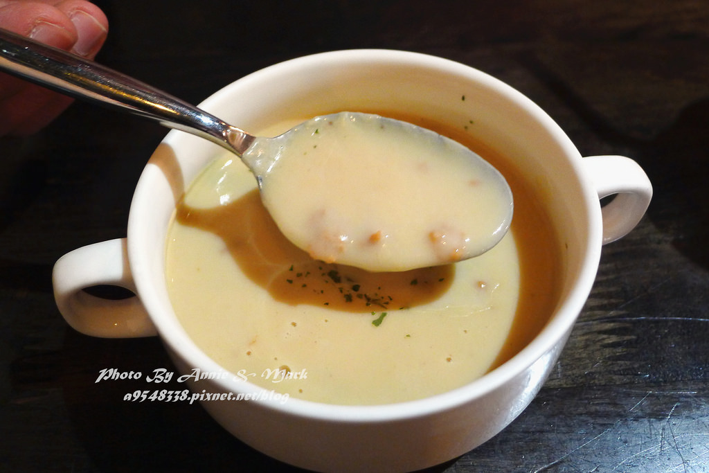 是奶油海鮮濃湯的樣子,相當濃郁,再加一點辣椒汁更加提味說!