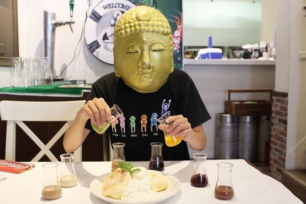 鬆餅和醬汁會放置在鐵盤上登場,而醬汁特別使用量杯,目的在於營造出一種在實驗室調配自己喜愛的幸福配方之感