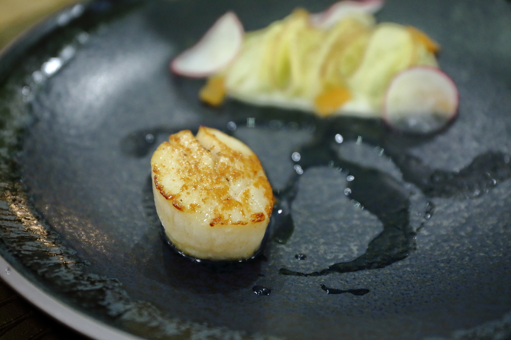 北海道生食等級干貝,煎至七分熟,起鍋前不斷淋上熱奶油增添香氣與表面的焦脆感,盤底再淋上用蘋果製成的醬汁