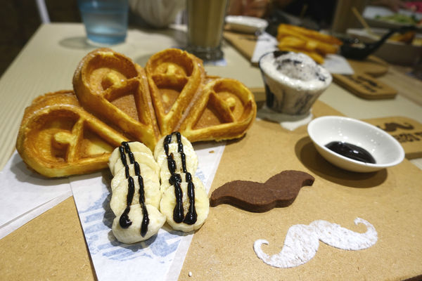 外脆內綿的鬆餅咬勁不賴,水滴狀的部分趁熱沾點巧克力醬吃又是另種味道~