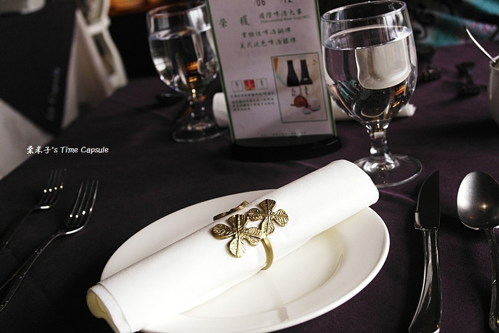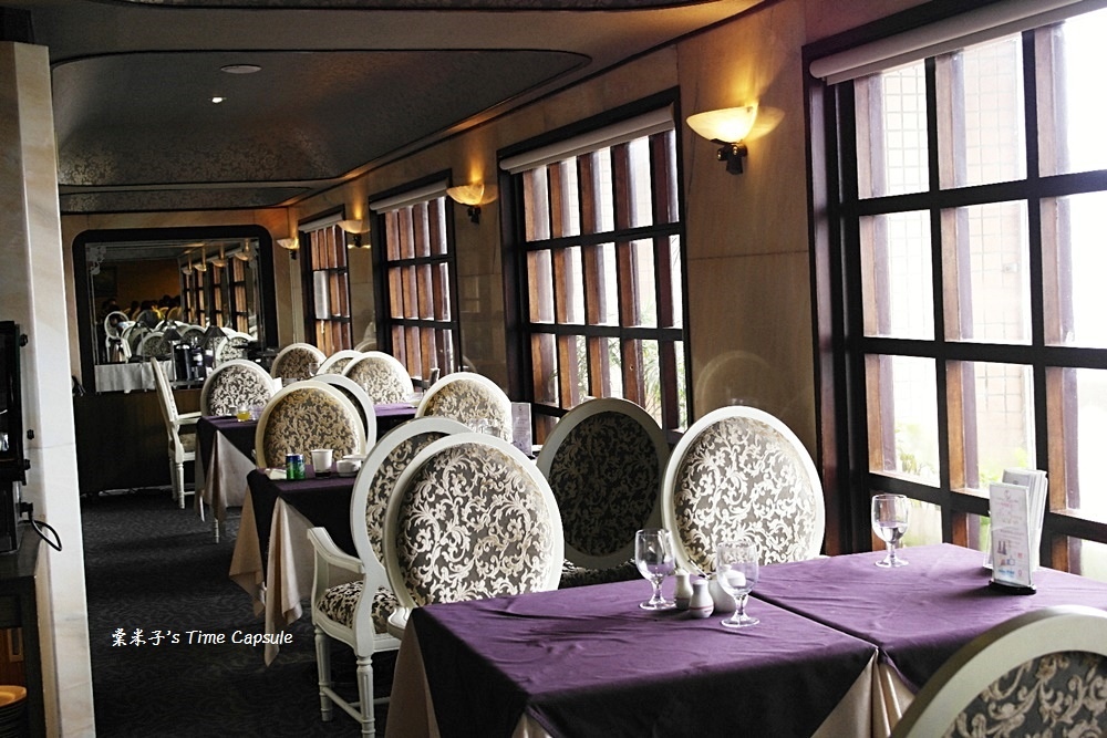 漂亮舒適的歐式鑲花古典座椅、紫色的桌巾、整齊的餐具,