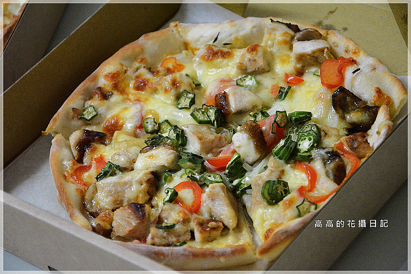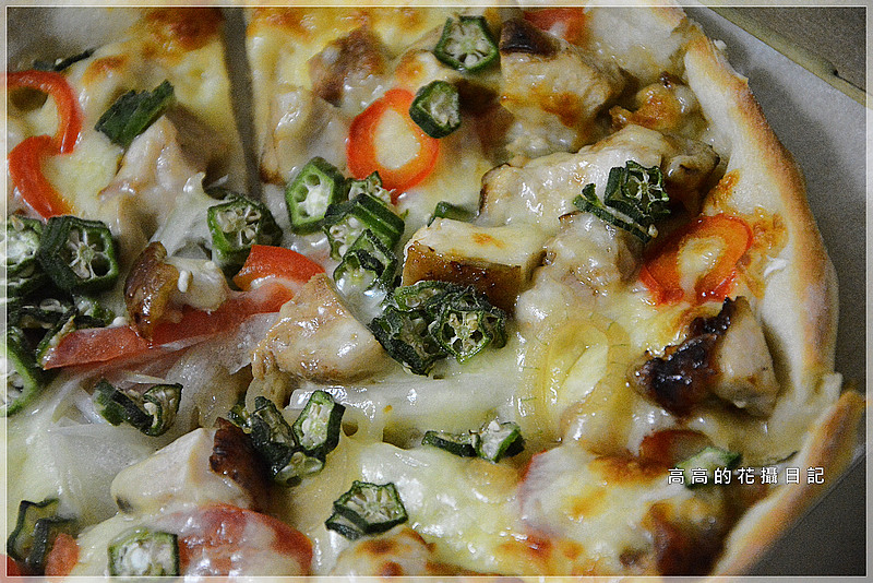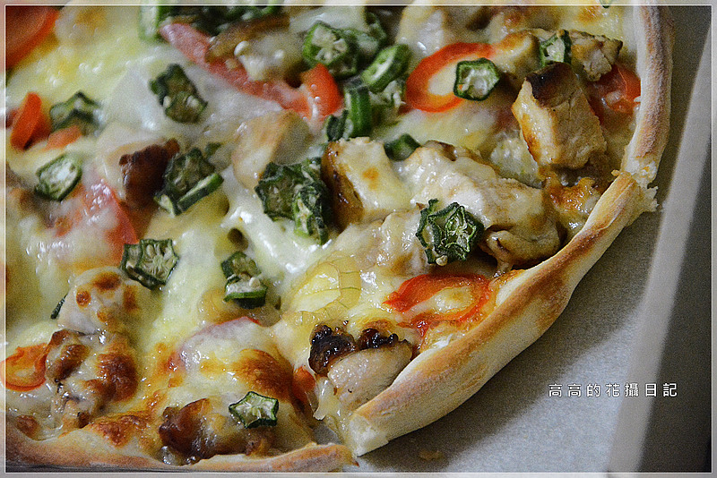 披薩上不手軟的放上了大量的秋葵、照燒雞肉塊、菇類、甜椒絲、洋蔥絲以及起司,