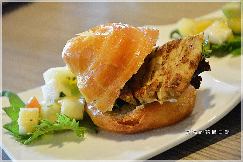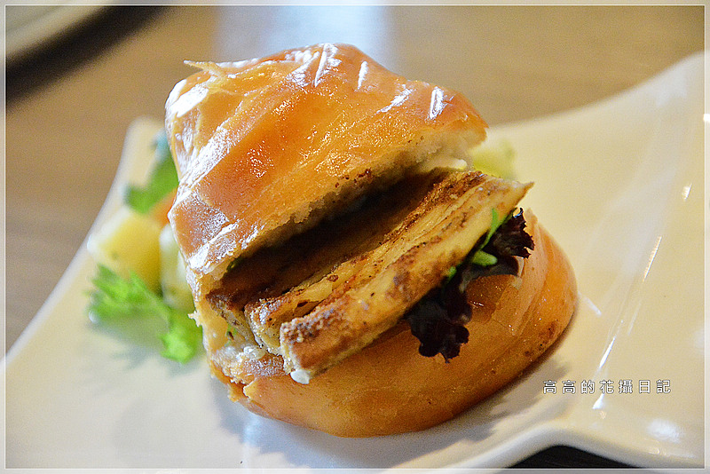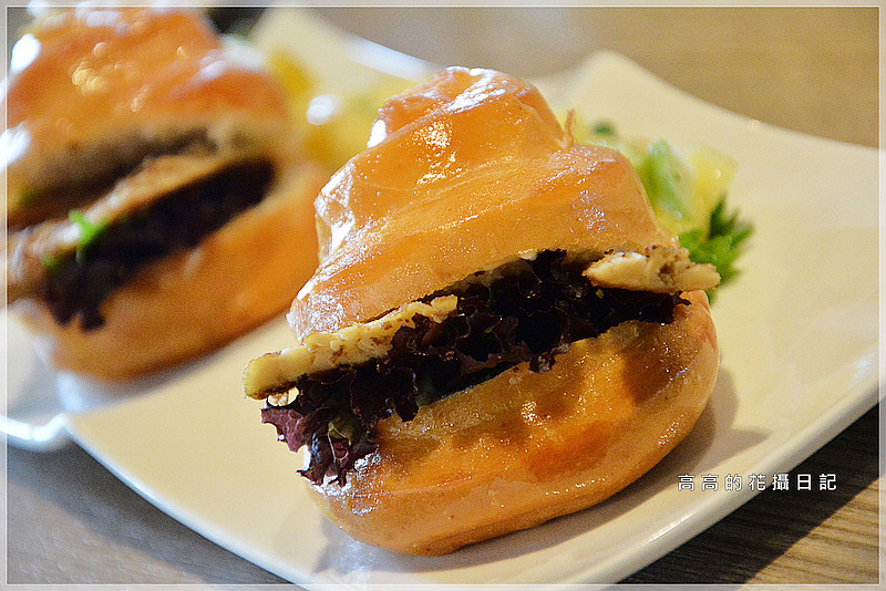 接著夾上生菜、杏鮑菇片,作成類似中式漢堡的感覺。