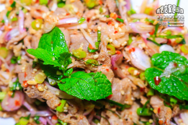 把豬肉切成薄片,川燙之後拌以泰式醬料,即是一道清爽開胃的涼拌豬,