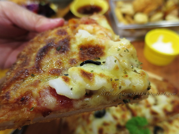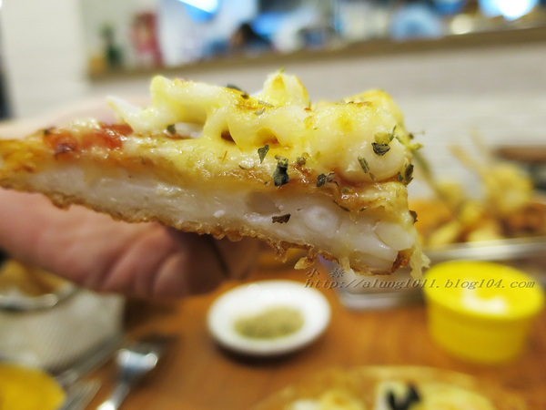 每一口都是脆口、飽滿的花枝漿、蝦仁漿,厚度比月亮蝦餅豐厚許多,上層酥脆的比薩餅皮有