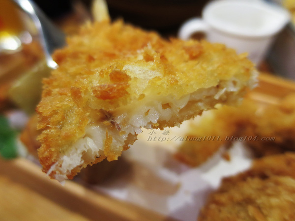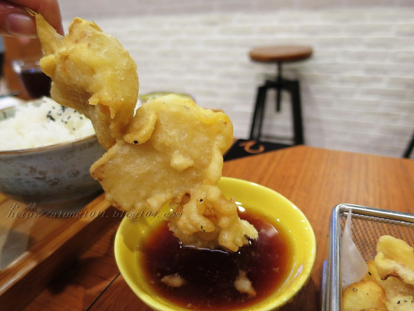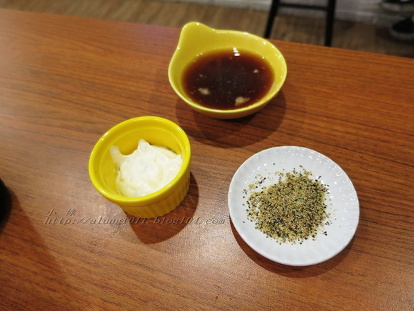 貼心的附上三種沾醬料:微酸濃郁的塔塔醬、蘿蔔泥和風醬汁、蒜香胡椒鹽。
