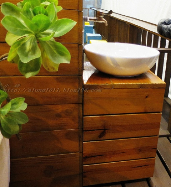 貼心設計供客人洗洗手(左);木柱條下有餐具調味料自助區可以自行取用(右)。