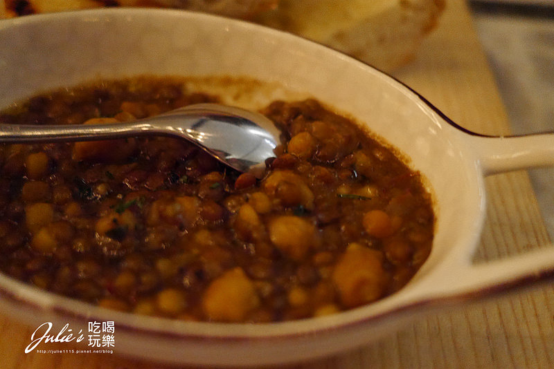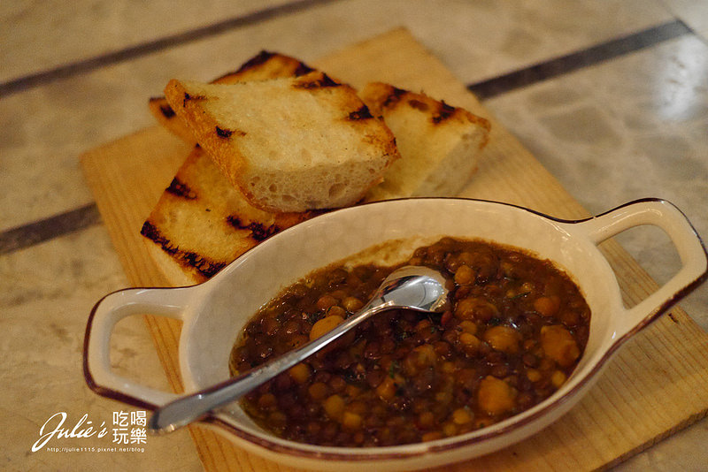 ↑麵包搭配咖哩扁豆醬,印象中麵包烤到表面有點焦香味,酥脆的口感還挺討喜的。