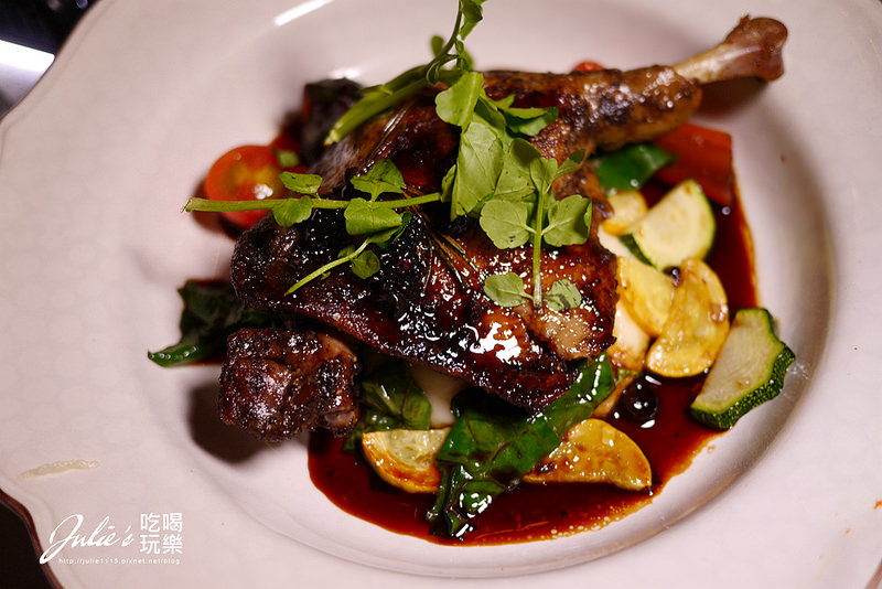 除了鴨腿本身,旁邊的配菜有節瓜番茄汁類的蔬菜,蔬菜會隨季節替換。