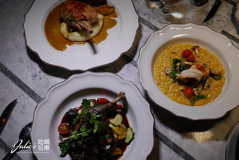 畫面上的是當天其中的三道菜,鴨腿、豬排跟燉飯。