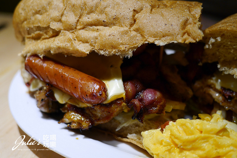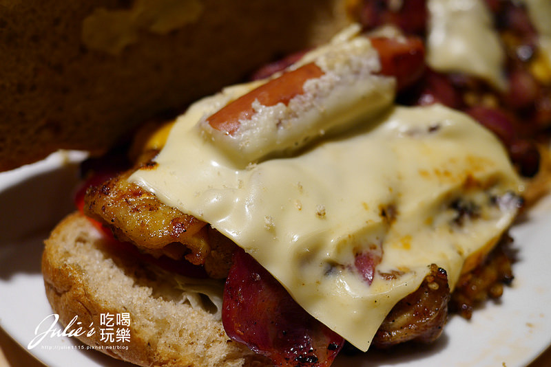↑這三明治大到我們都不知道該如何下手,一往下切,德式香腸就跑出來了。