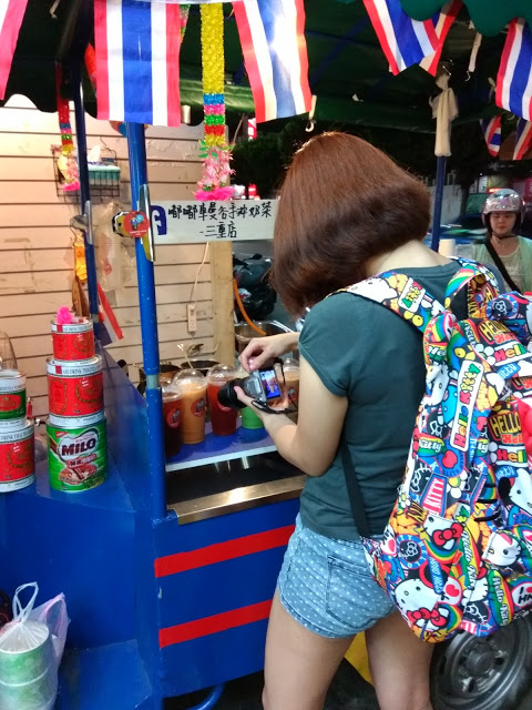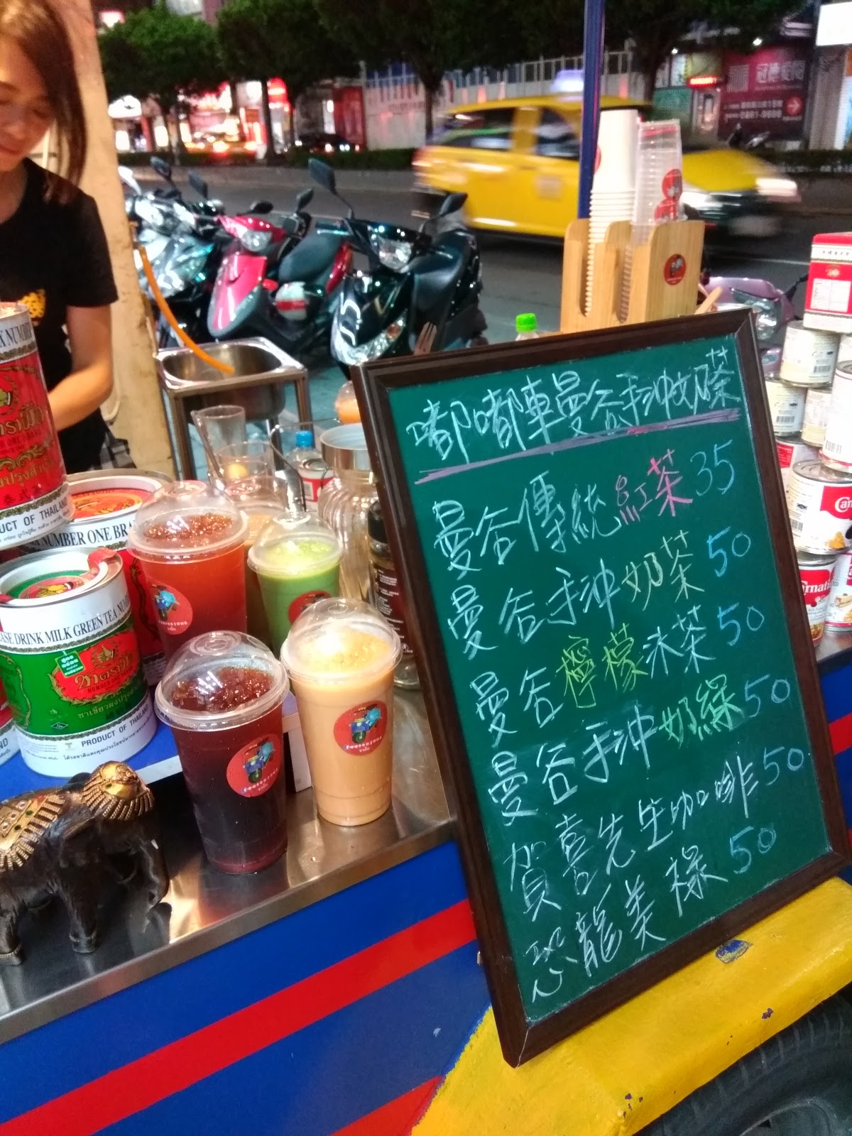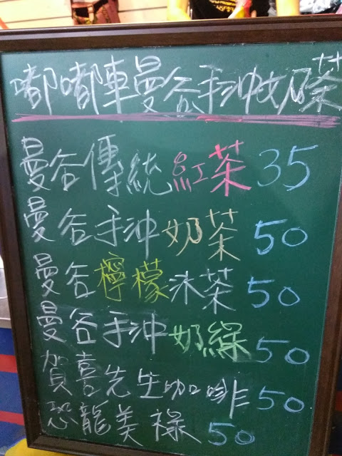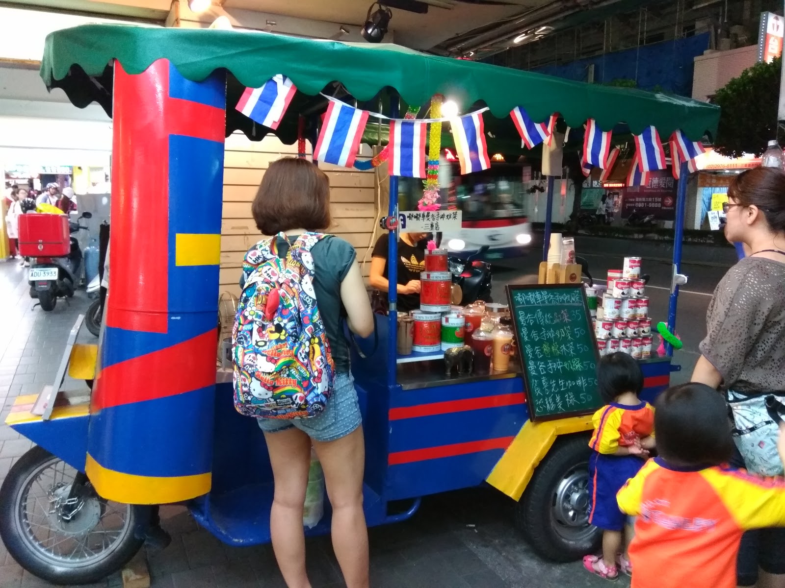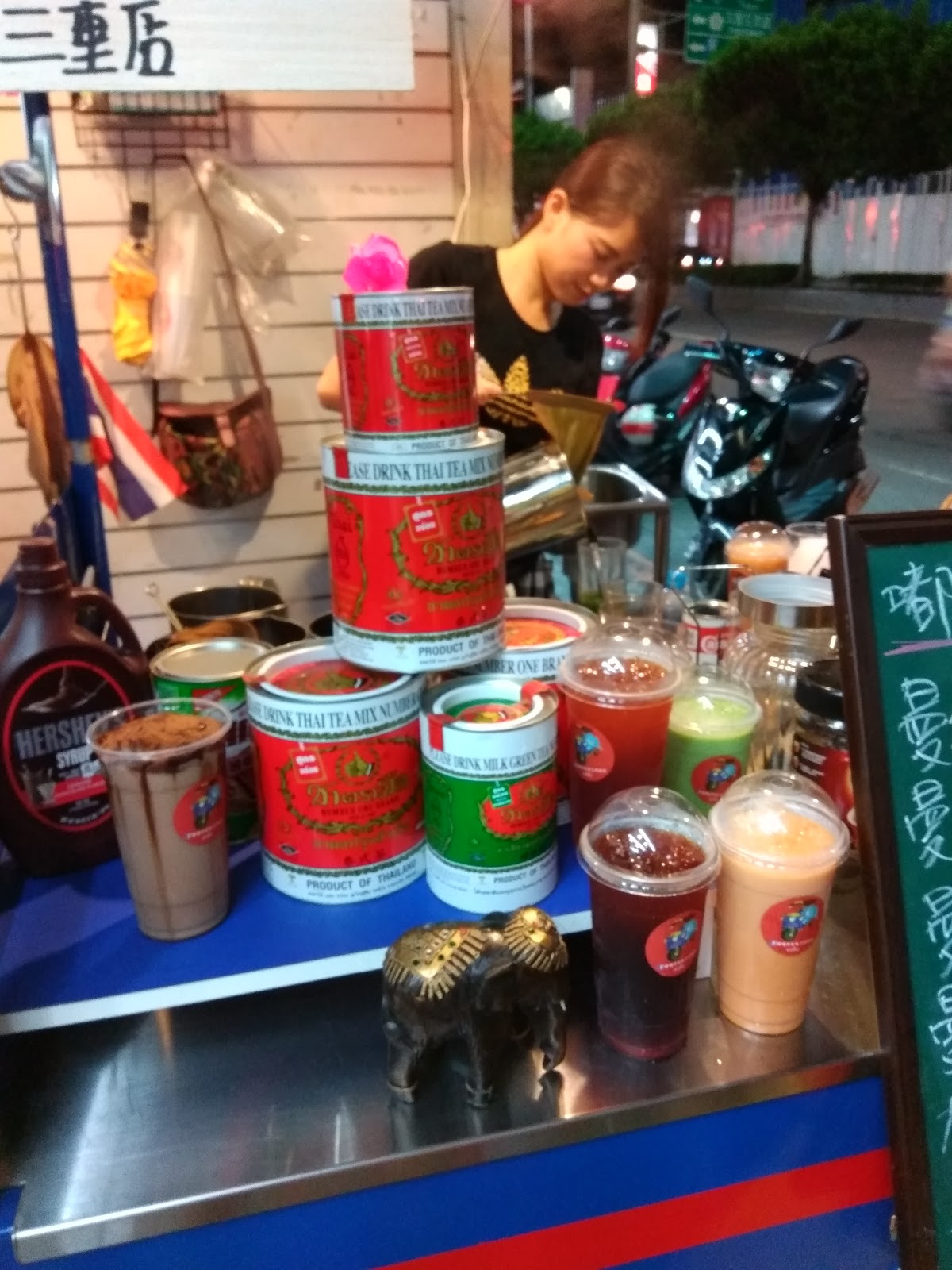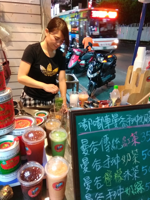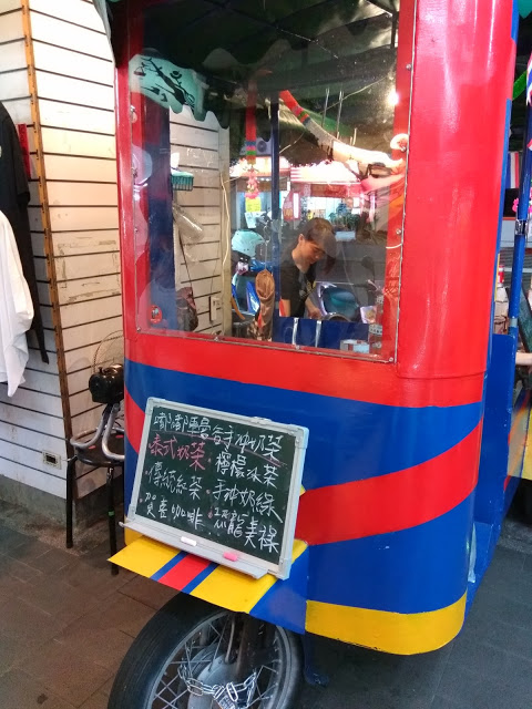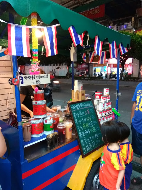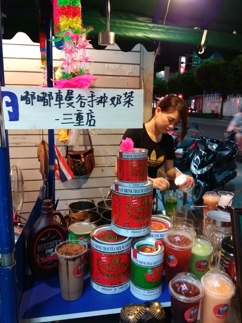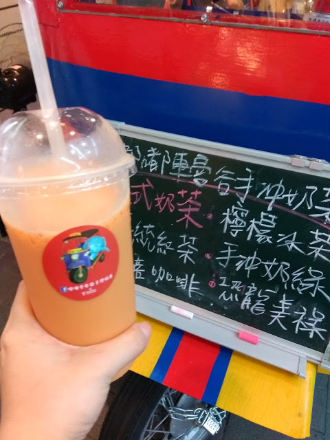 在三重街頭出現一台很可愛的嘟嘟車,上面擺滿了各式泡茶的器具,及色彩鮮艷小旗子還有花圈,頓時愰神覺得自己似乎在曼谷街頭,老闆娘很熱情的招呼客人,雖然天氣很熱,她滿頭大汗,還是很親切的招呼客人,你要喝什麼?還有那位客人沒有點?