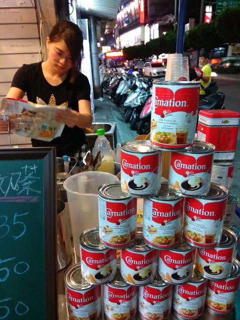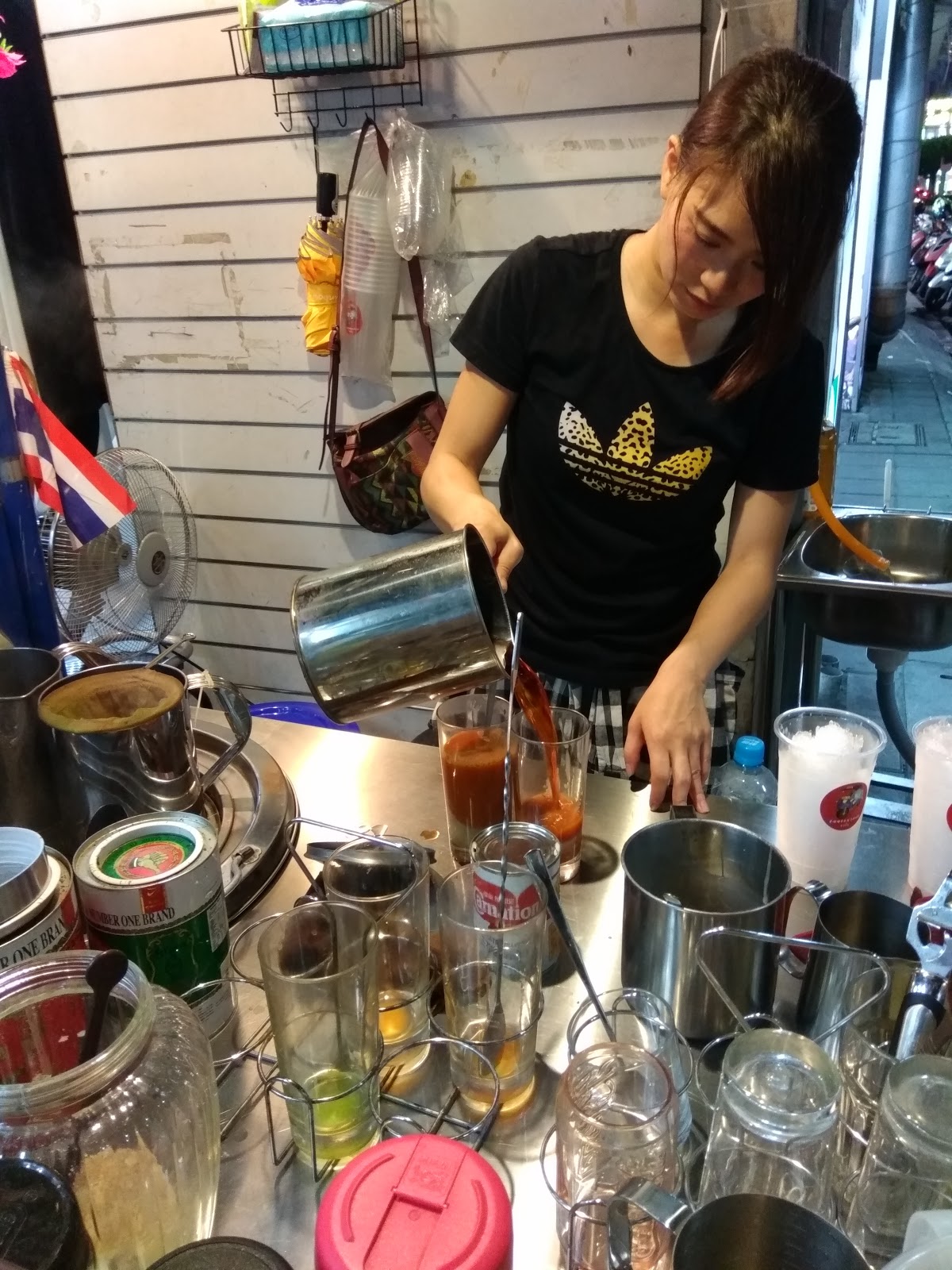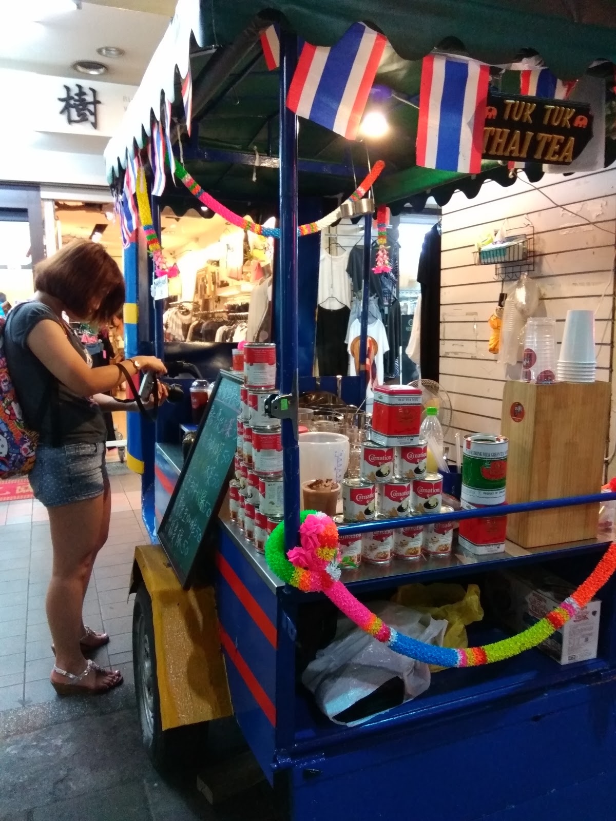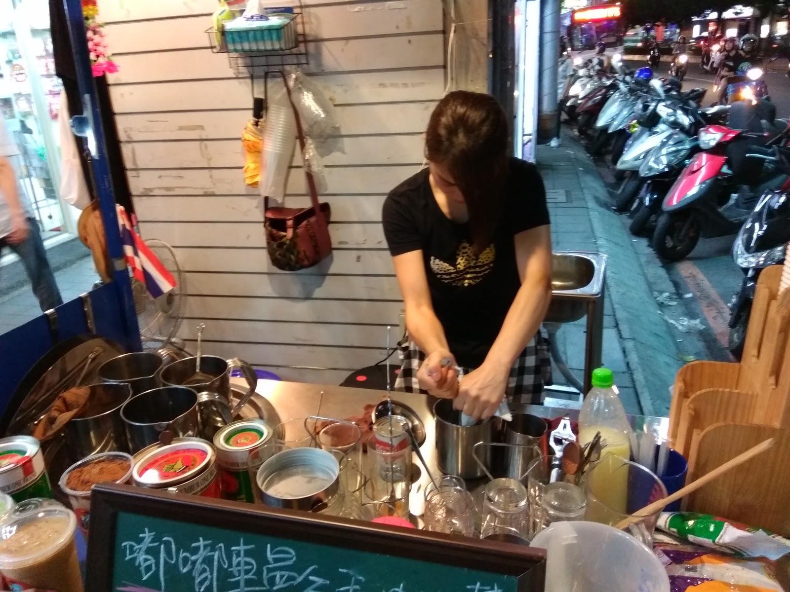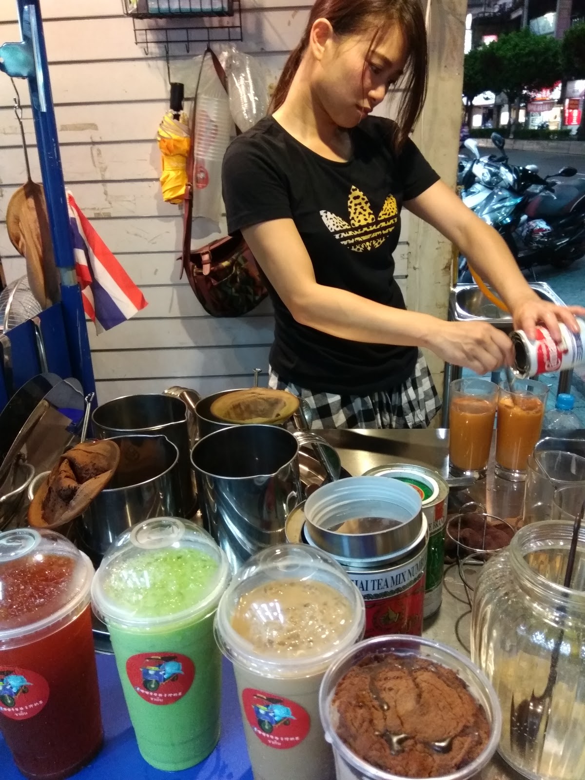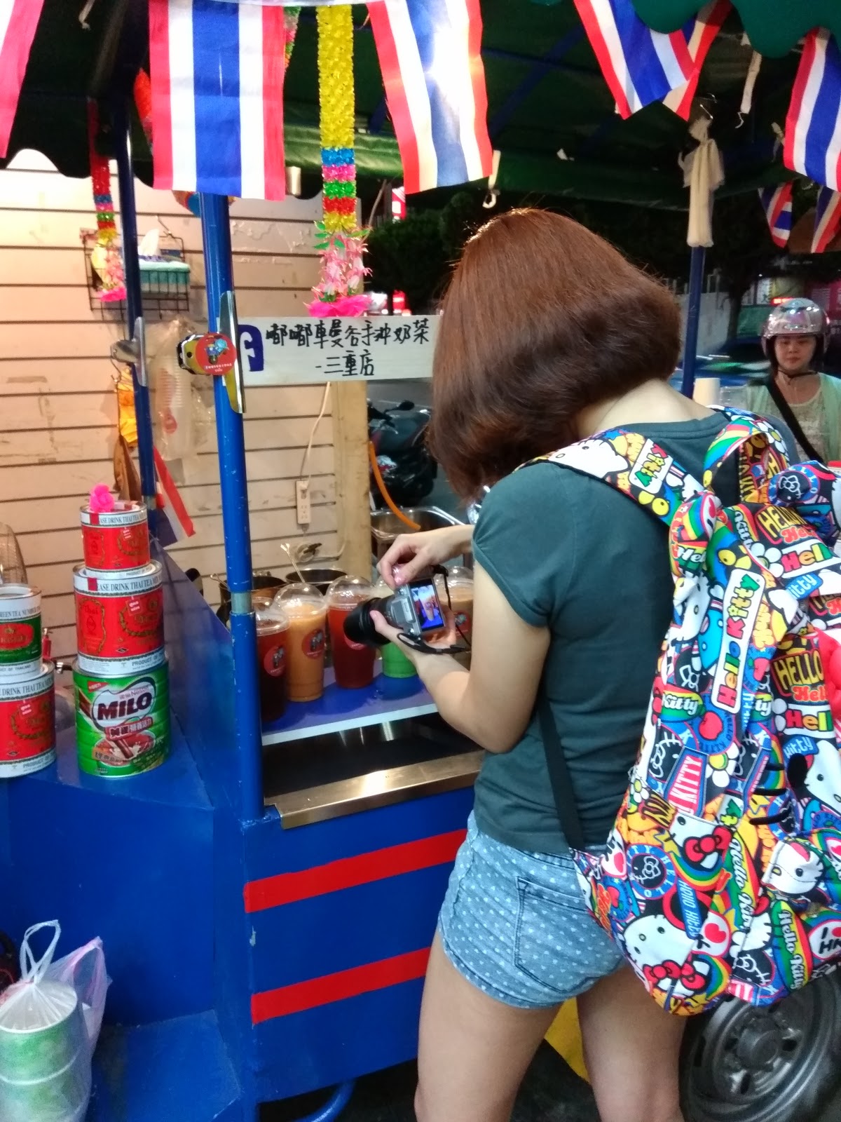 在三重街頭出現一台很可愛的嘟嘟車,上面擺滿了各式泡茶的器具,及色彩鮮艷小旗子還有花圈,頓時愰神覺得自己似乎在曼谷街頭,老闆娘很熱情的招呼客人,雖然天氣很熱,她滿頭大汗,還是很親切的招呼客人,你要喝什麼?還有那位客人沒有點?
