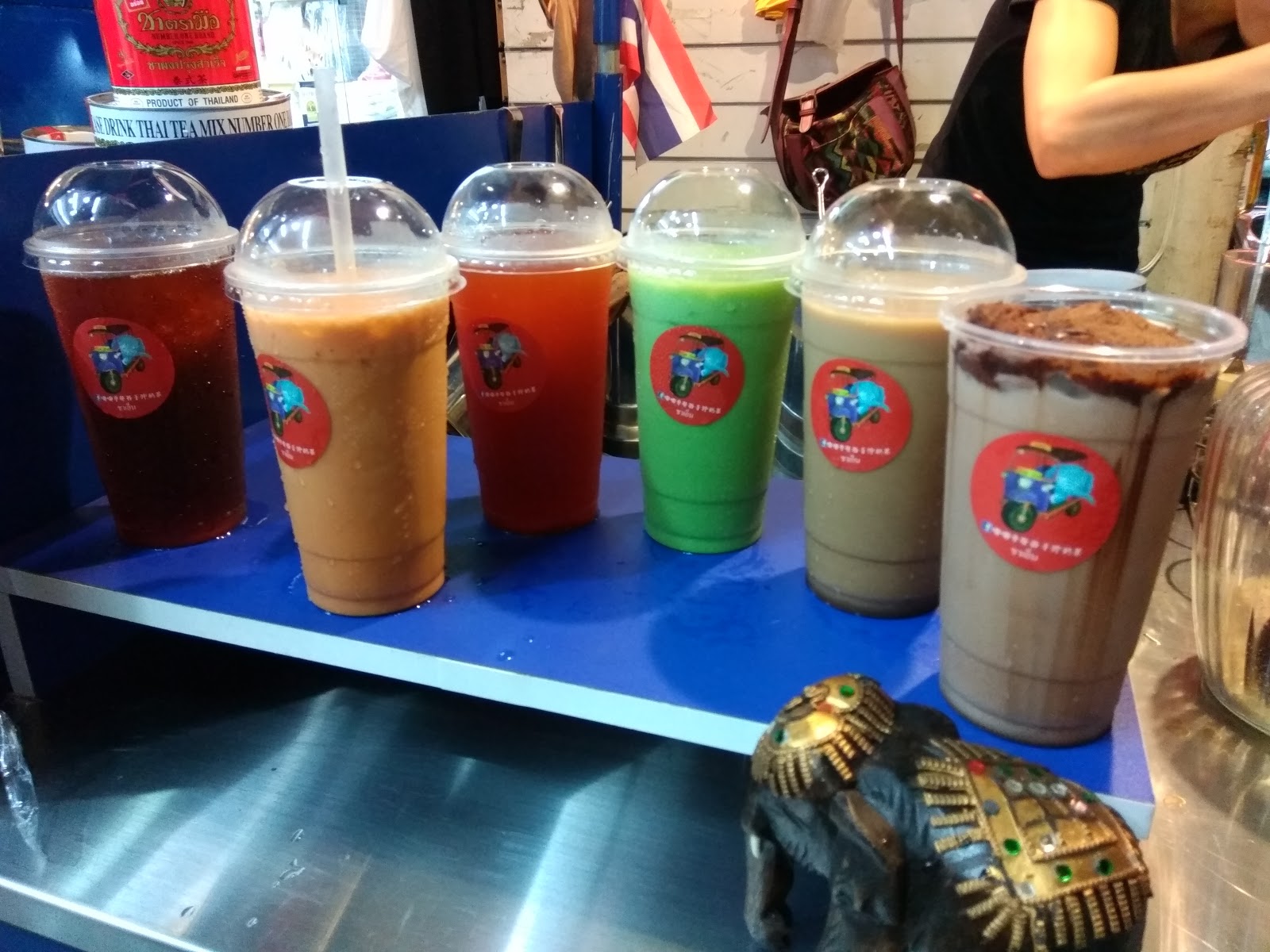 | 車上有好多泰式的泡茶器具,還有一隻大象裝飾品 |
