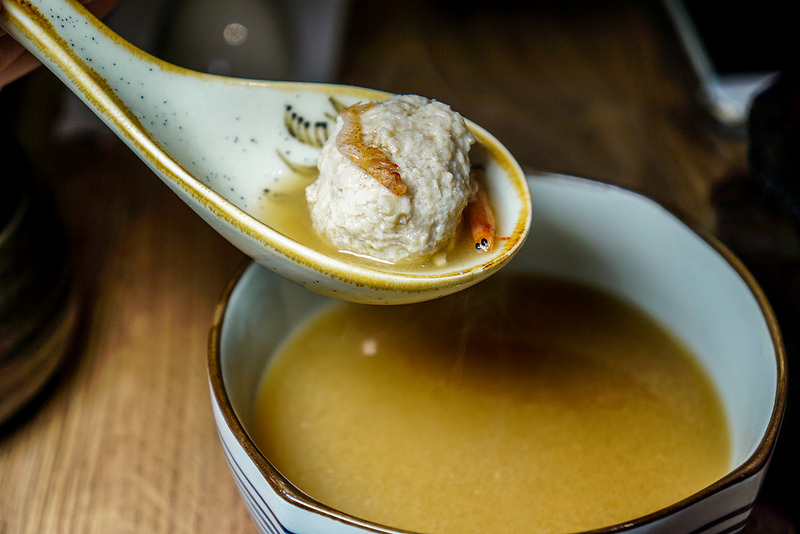 味增湯, 每一碗丼飯都附一碗湯, 湯裡擺了櫻花蝦提味, 有附一顆雞肉丸, 裡面放了大量的雞軟骨, 脆又好吃