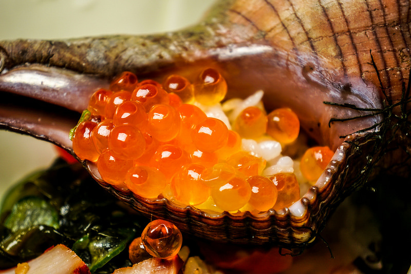 一整顆大海螺擺在飯中間加上海膽與鮭魚卵視覺效果十足