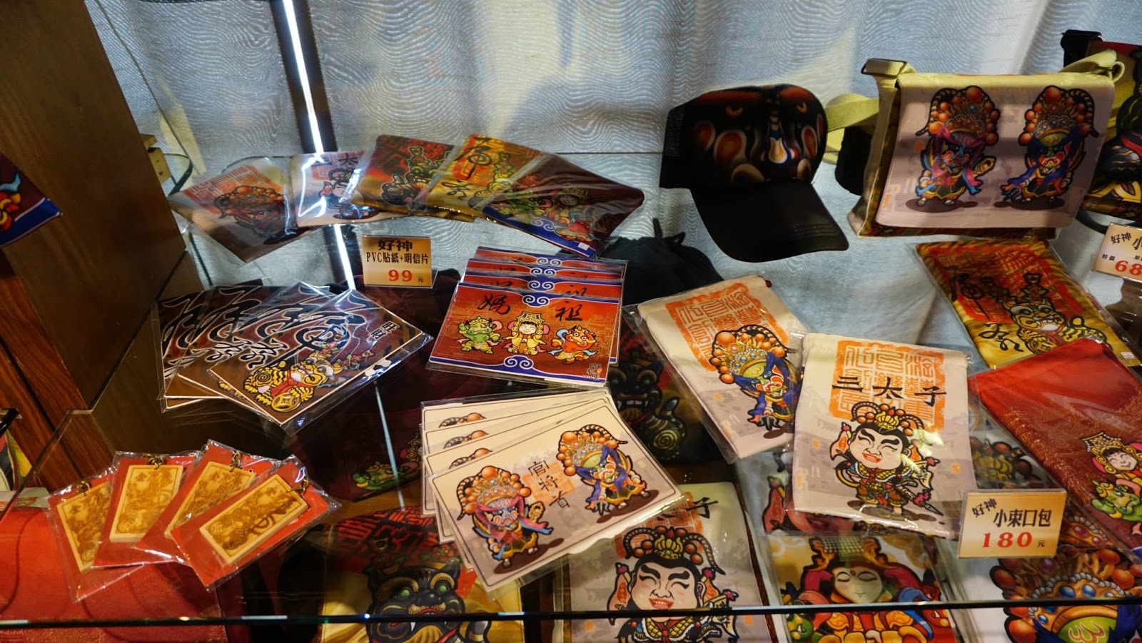 ▲可愛畫風「媽祖、三太子、官將首」的小束口包及貼紙。