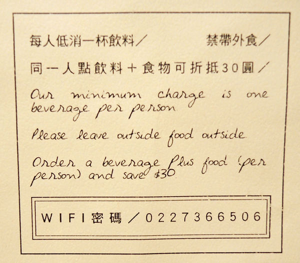 店家消費沒有服務費(但還是很貼心的會倒水呀~)、低消一杯飲料,同一人點飲料+食物可折抵30元