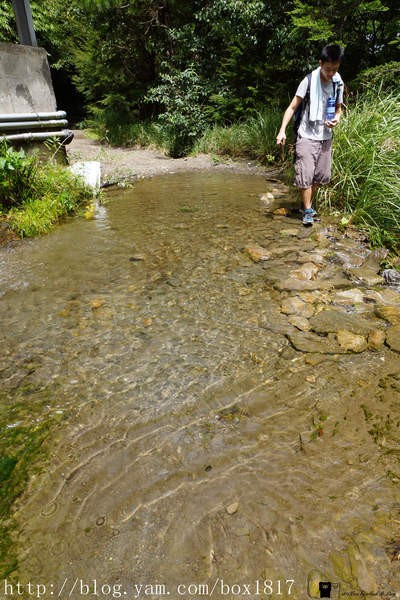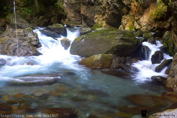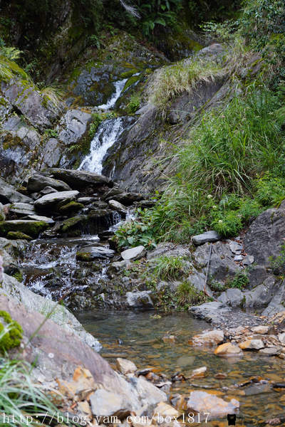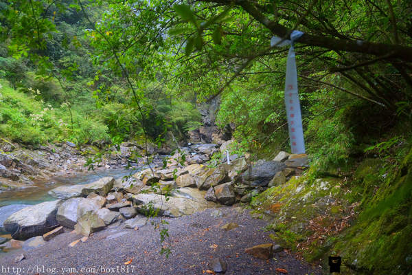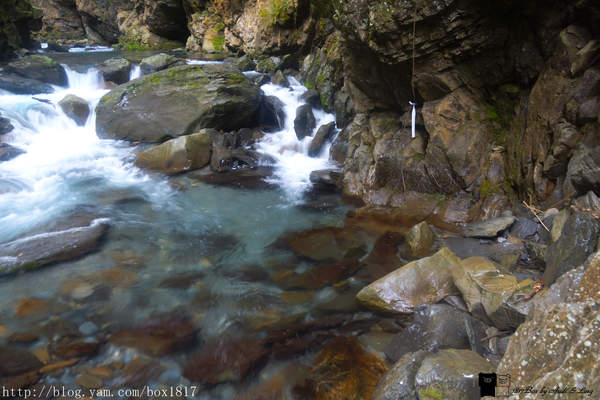 石頭上的繩索是登山客使用,由此可進入合歡西峰,必須從這邊涉水通過,