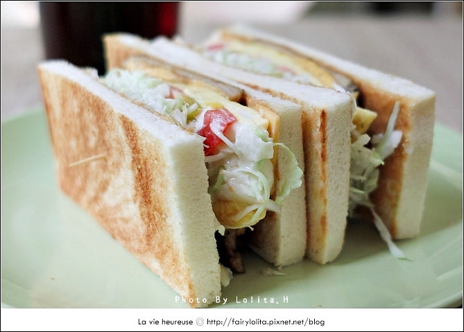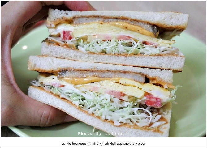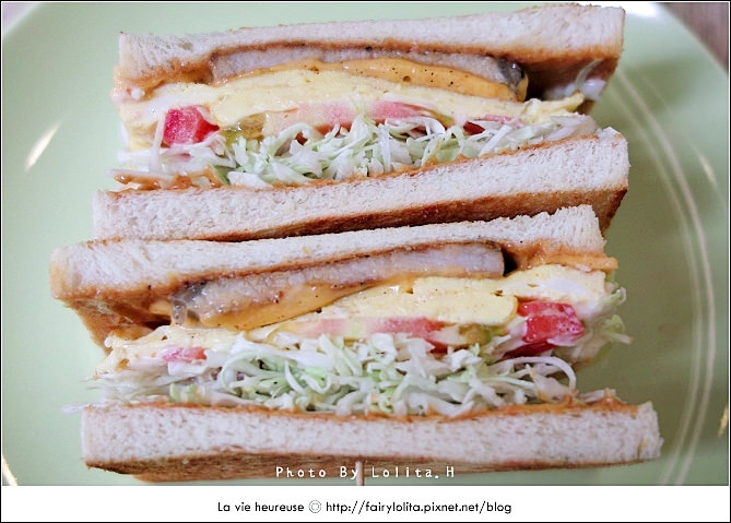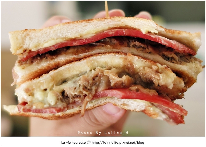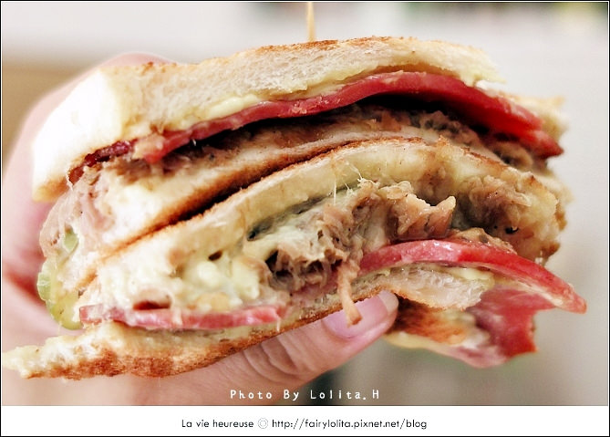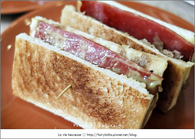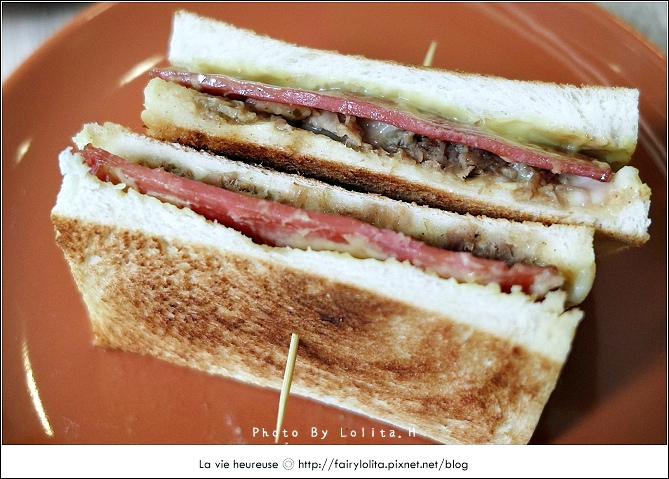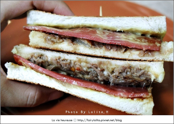 吐司中夾著燉肉、火腿,還有店家自己調配的醬汁,剛開始覺得它並不起眼,但燉肉卻非常好吃,鹹香入味,口口紮實又飽嘴,我覺得它其實有點像是鮪魚沙拉的口味,只是呈現出來的是豬肉香氣,雖然店家很推薦肉蛋起司,但這個燉肉更是幾爸昏!