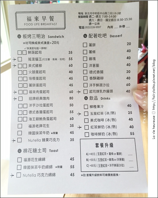 食材主要以板烤三明治為主,有鹹有甜,讓我眼晴一亮的是竟然還有之前超流行造成搶購的韓國抹茶,看到一定要點來吃吃看的,其它也有炸物等等的小點心,如果看到有小飛機,那就是店家主廚推薦的招牌呦!