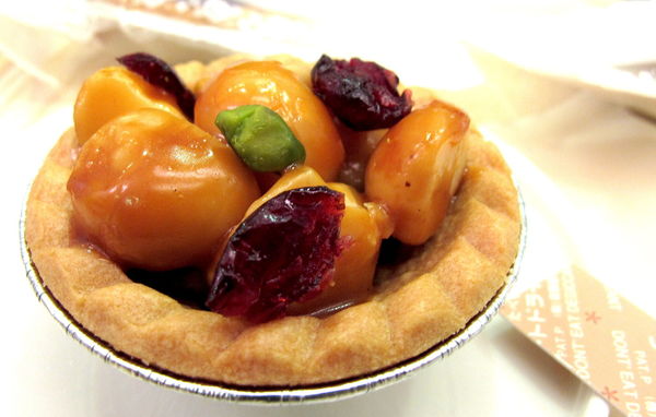 豆塔精緻的外觀,可看見店家細心地鋪排上夏威夷豆&蔓越莓果乾!