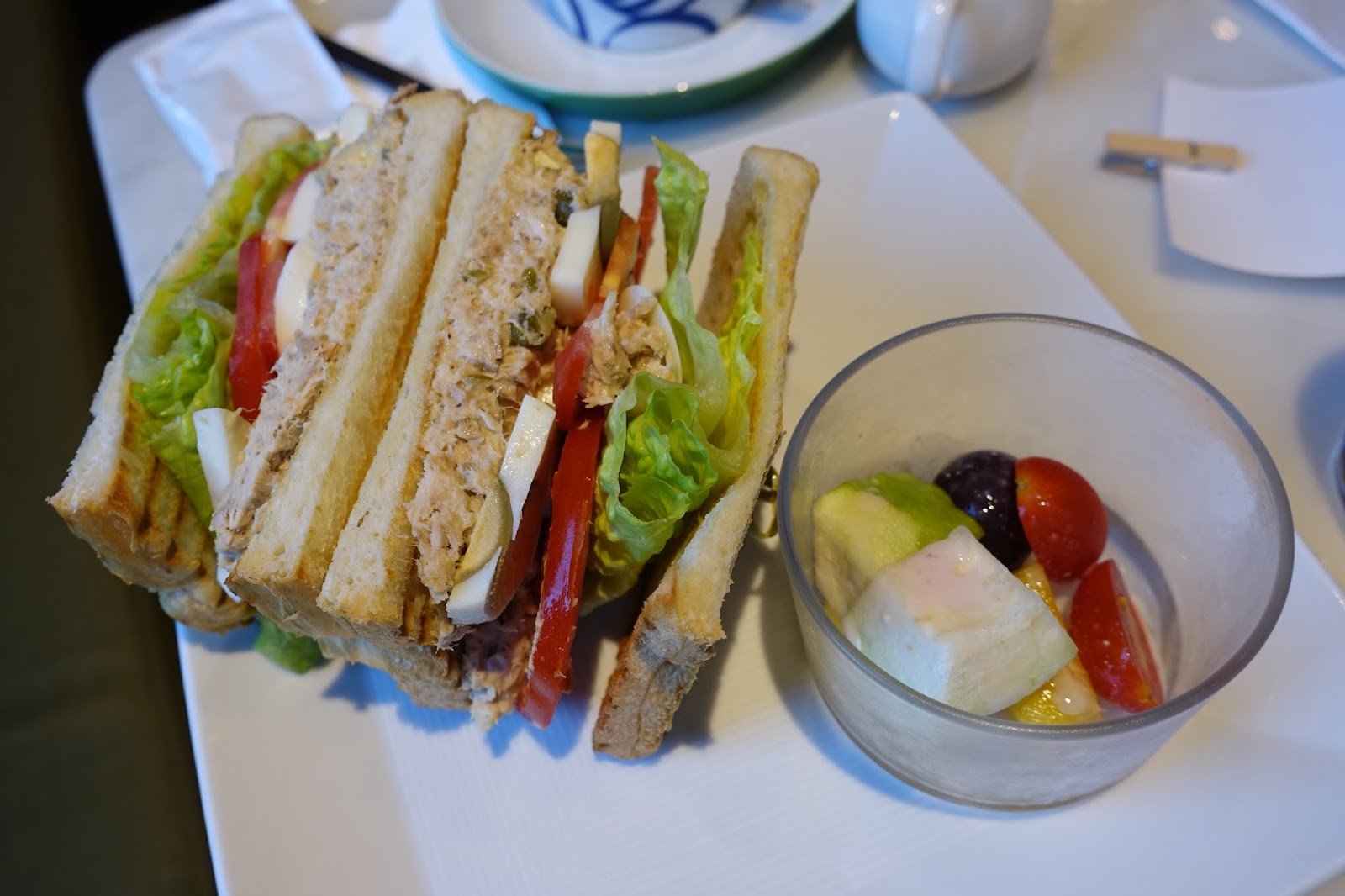 鮪魚醬水煮蛋三明治份量出奇的大,現烤的吐司中間夾著飽滿的鮪魚肉、水煮蛋與番茄、生菜,憑我一個人是吃不完的,胃口小的女孩可以考慮共享早餐,兩個人吃一份剛剛好!水果杯裡各式的新鮮水果,增加了這份早餐的清新度!