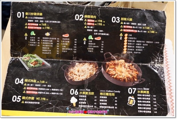 【1.春川炒雞排鍋】【2.韓式炸雞】【3.棉花糖泡泡】【4.韓式拌飯】
