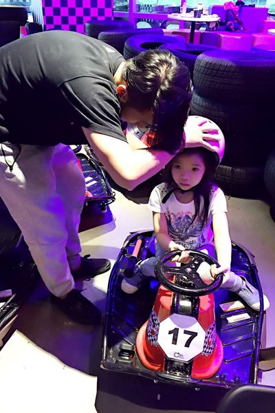 真沒想到對陌生人會頗害羞的小Abbie,竟然願意坐在大哥哥身上玩賽車…(驚)