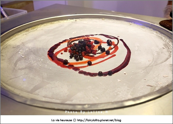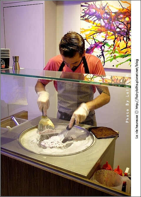 我們選了擁有初戀酸甜滋味的綜合莓果,先在炒盤上放置各式新鮮莓果,再淋上冰淇淋,就等著帥哥老闆來表演囉!其實這個捲捲冰就是台灣的炒冰,也許有顏值超高老闆是賣點,怎感覺這炒冰變得時尚又高級起來了。
