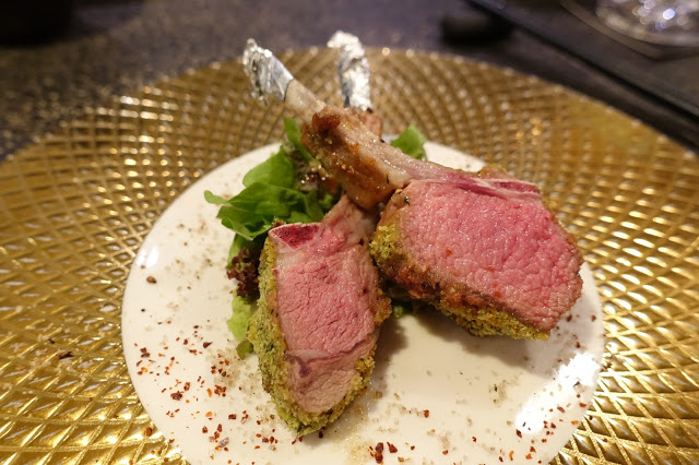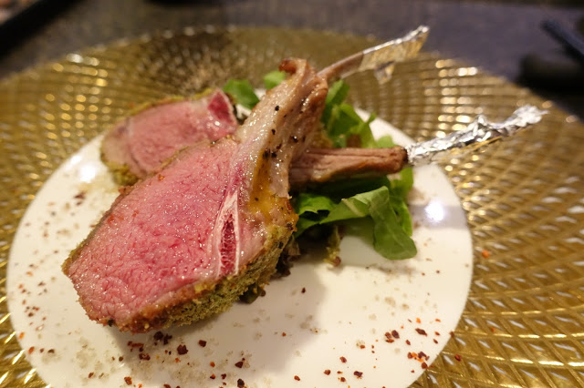 將法式羊排以和風呈現,羊排烤得恰到好處、肉汁滿盈,切開呈現粉紅色的肉質,外側裹著香料,沾著盤邊的鹽粒,馥郁辛香的鮮嫩、真實呈現食材的好滋味。