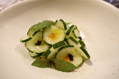 第一道前菜使用台灣在地無刺品種的小黃瓜,嘗起來格外清甜,巧妙的刀工讓小黃瓜口感更佳,綴上幾滴橄欖油、點上魚卵與珍貴的魚子醬,再以羅勒提香,讓這道清爽的前菜顯得彌足珍貴。