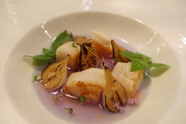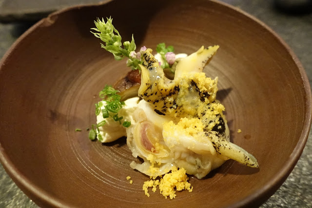碩大的海螺肉造型搶眼,嘗起來海味新鮮爽脆的甘甜直入內心,配菜茄子為了與海螺的爽脆相呼應煮得稍有口感,不似一般茄子糊軟,以食用花與料理結合的巧思,吃得到花的清香但又沒有生味,裝盛的器皿也蘊藏巧思,整盤菜宛如花園般的清新綠意,教人留下深刻印象。