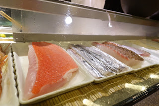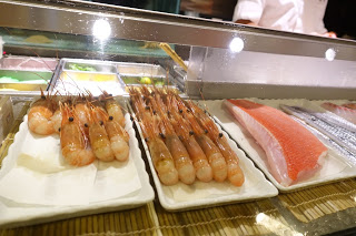 壽司檯前的玻璃櫃內放了各色的海鮮食材,看得我垂涎欲滴。